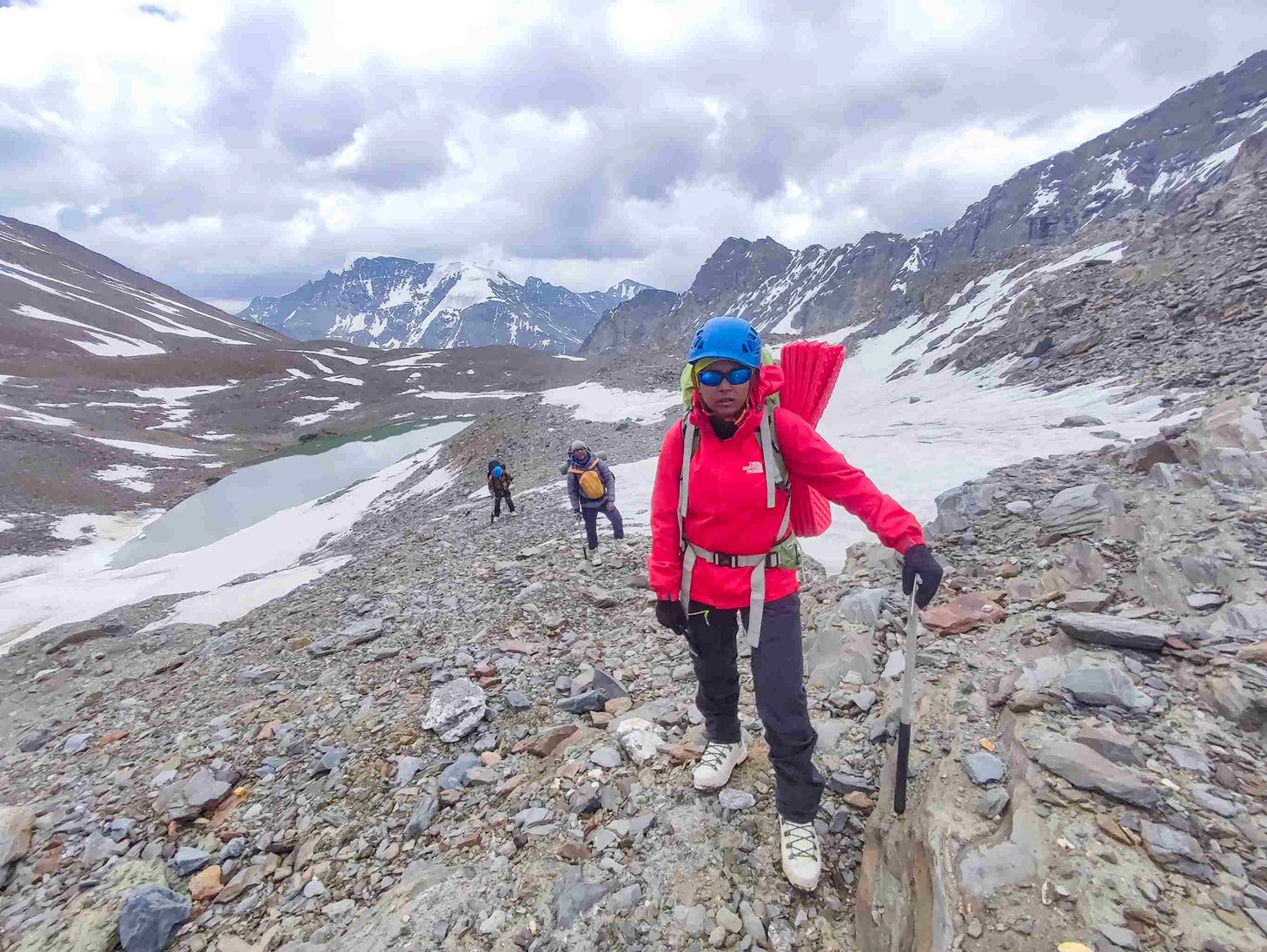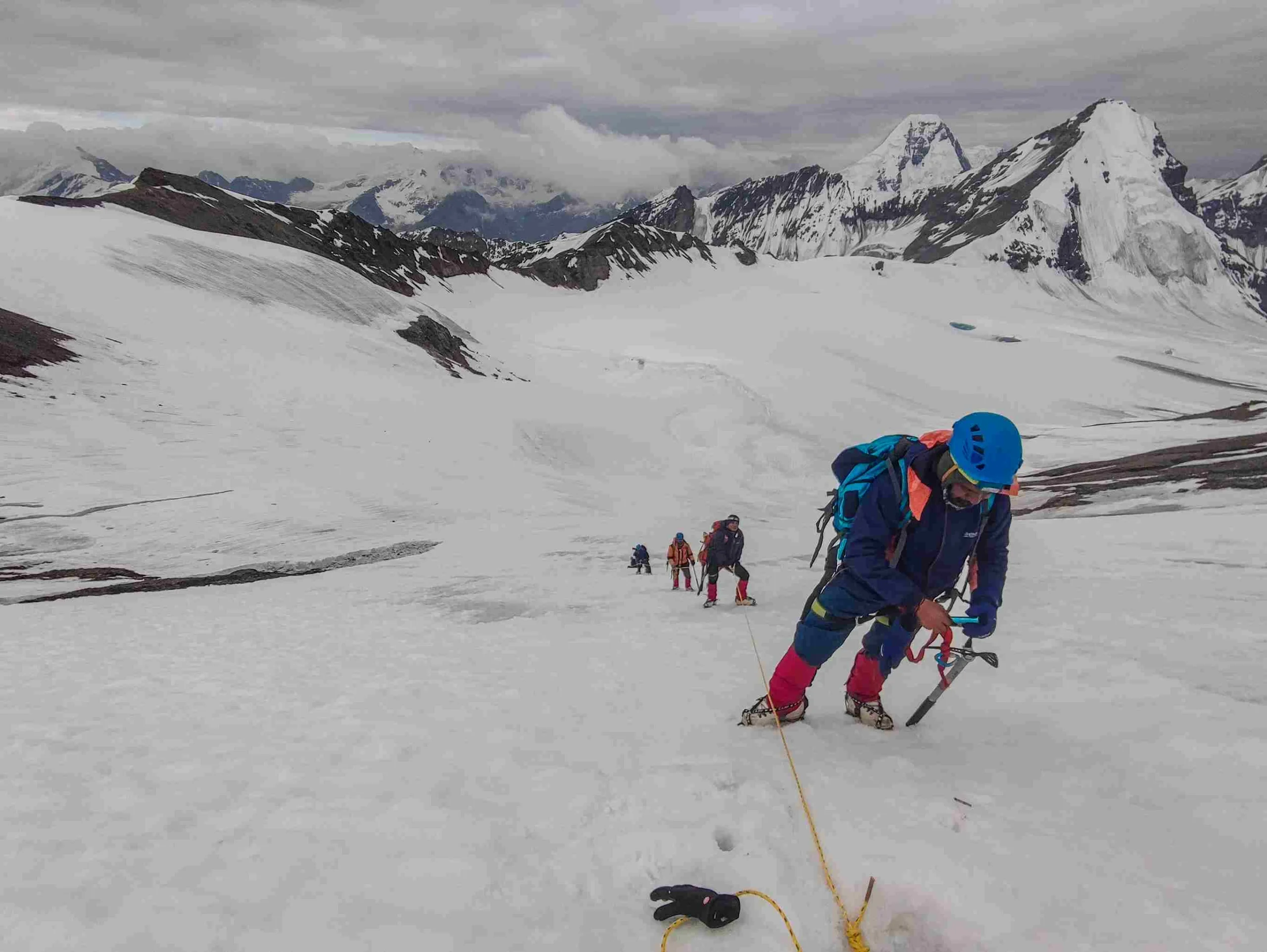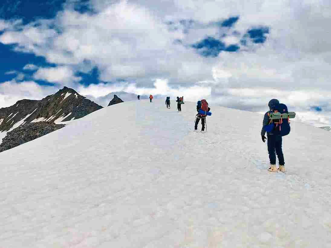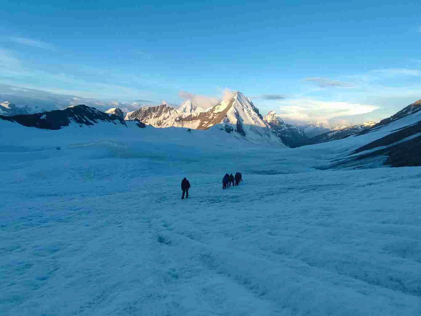 The expedition involves establishing Camp I at 5600 meters, requiring trekkers to move efficiently over snowfields and glacial terrain. Load ferrying helps the body prepare for summit altitude while minimizing risk. The summit push to Shinkun West (6127 M) is a demanding alpine climb involving steep snow slopes, rope-assisted movement, early-morning ascent, and careful descent planning.
