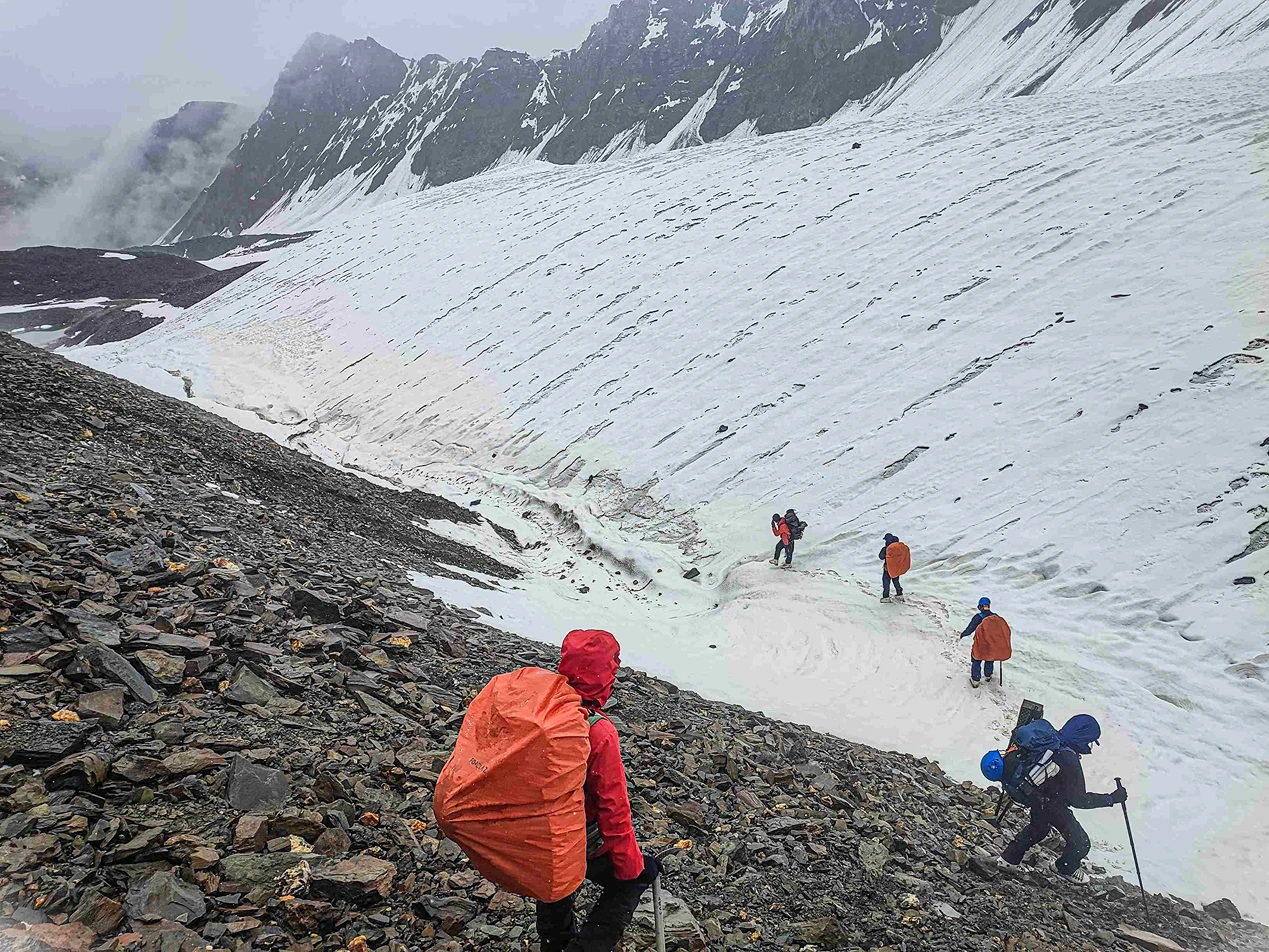 From the summit, trekkers are rewarded with expansive views of the Greater Himalayas, Zanskar ranges, Lahaul peaks, and remote glacier systems—a visual confirmation of having crossed into the world of high-altitude mountaineering.