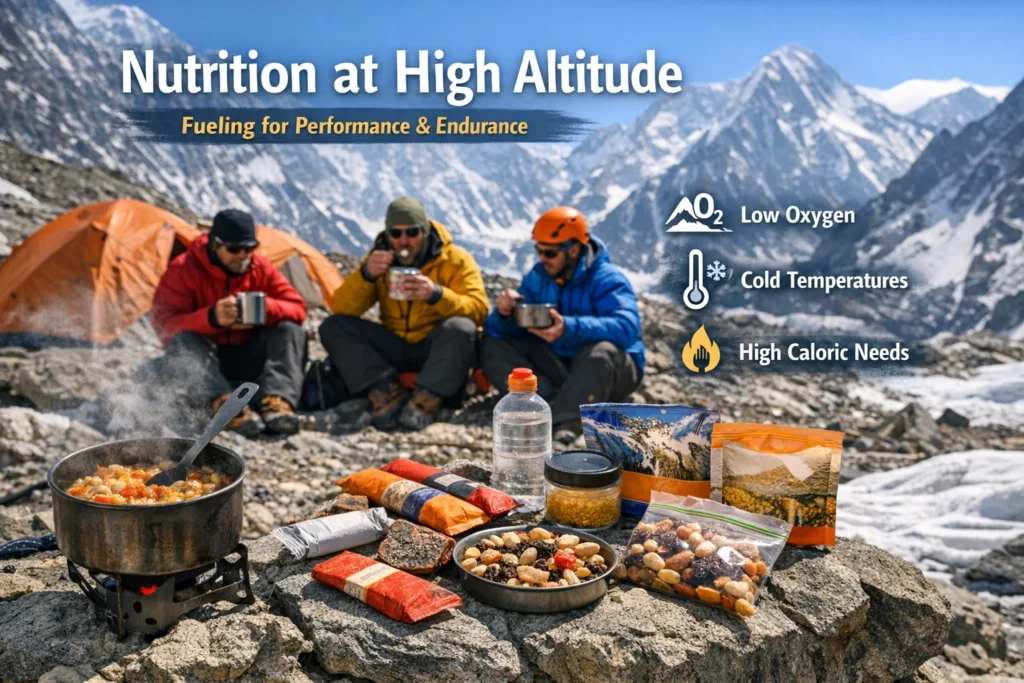 This guide explains how nutrition strategies shift in high mountains and how trekkers and expedition climbers can fuel their bodies effectively for safety, endurance, and performance.