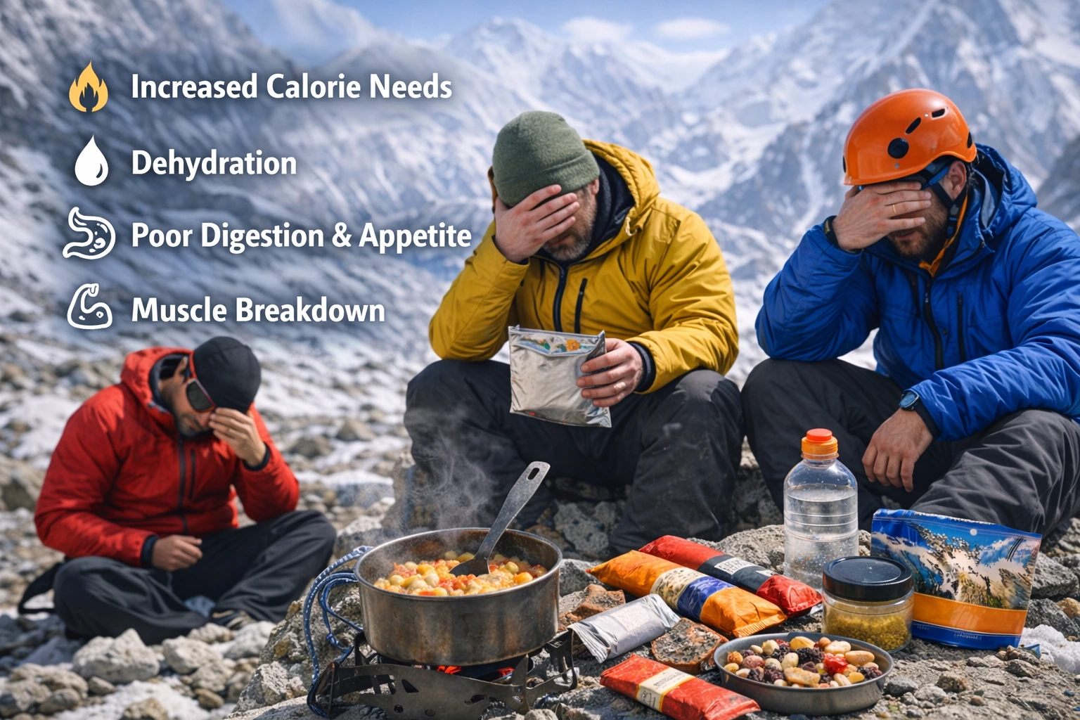 Despite these demands, appetite often declines above 3,000 meters. Hormonal changes suppress hunger, and fatigue reduces motivation to eat. This creates a calorie deficit that accumulates daily, leading to rapid weight loss, weakness, and reduced performance.