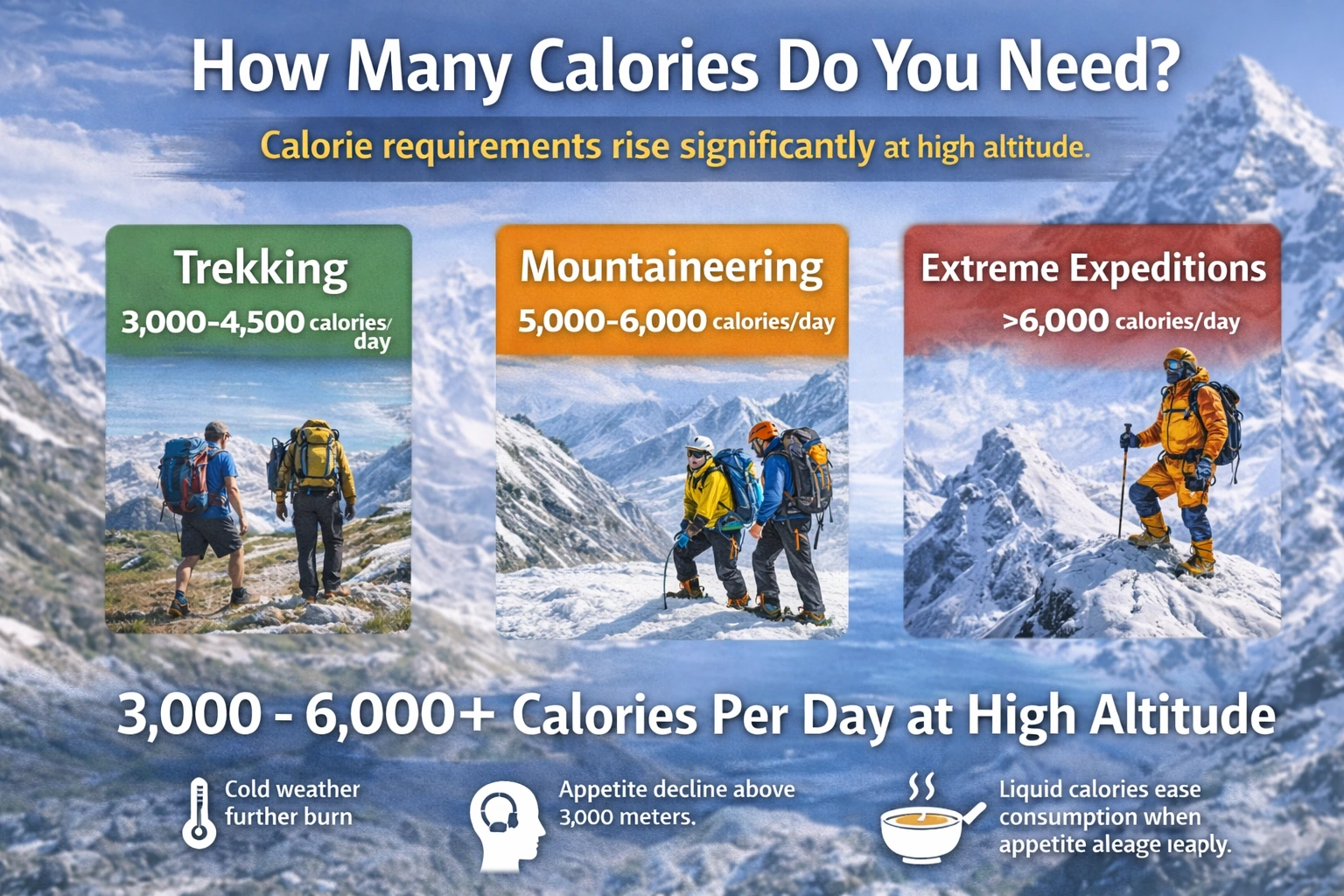 At moderate altitude during multi-day trekking, energy needs typically range between 3,000 to 4,500 calories per day. For technical mountaineering expeditions involving heavy load carries, glacier travel, and summit pushes, requirements can climb to 5,000–6,000 calories per day.