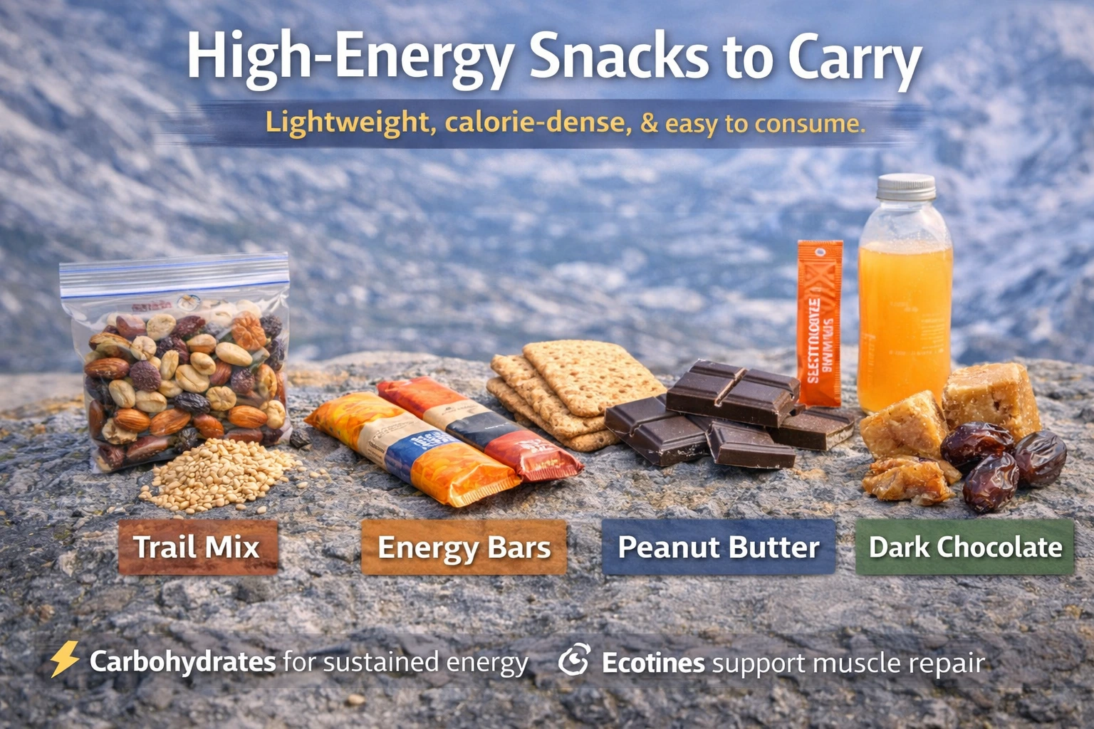 Snacking becomes critical during long trekking stretches when stopping for full meals is impractical. High-energy snacks should be lightweight, non-perishable, calorie-dense, and easy to consume without preparation.