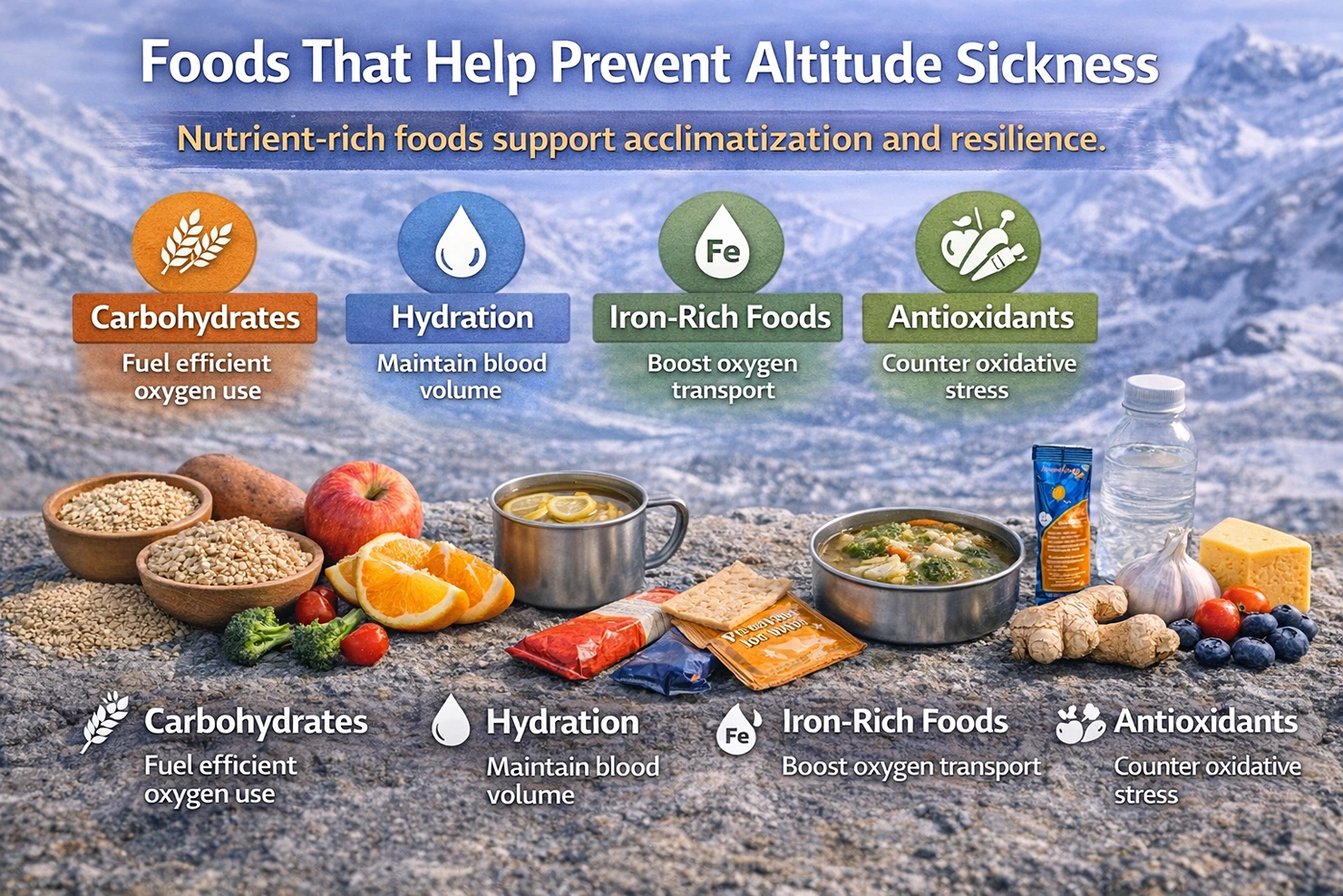 Antioxidant-rich foods help counter oxidative stress caused by altitude exposure. Fruits and vegetables with strong natural colors typically contain beneficial antioxidants.